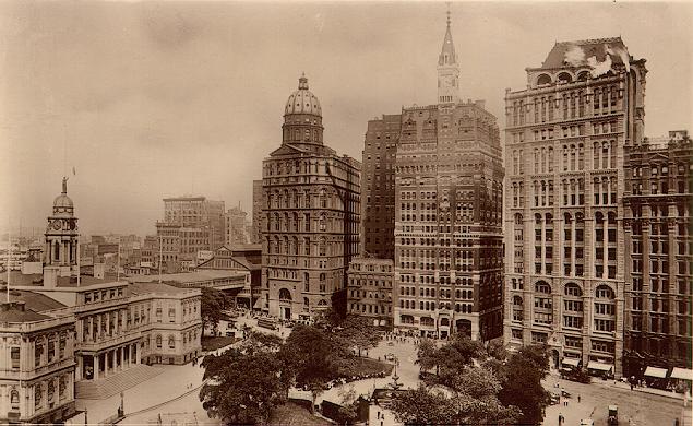 The New York World, Herald and Times, left to right, across from City Hall. Bridge. Photo from New York Architecture.