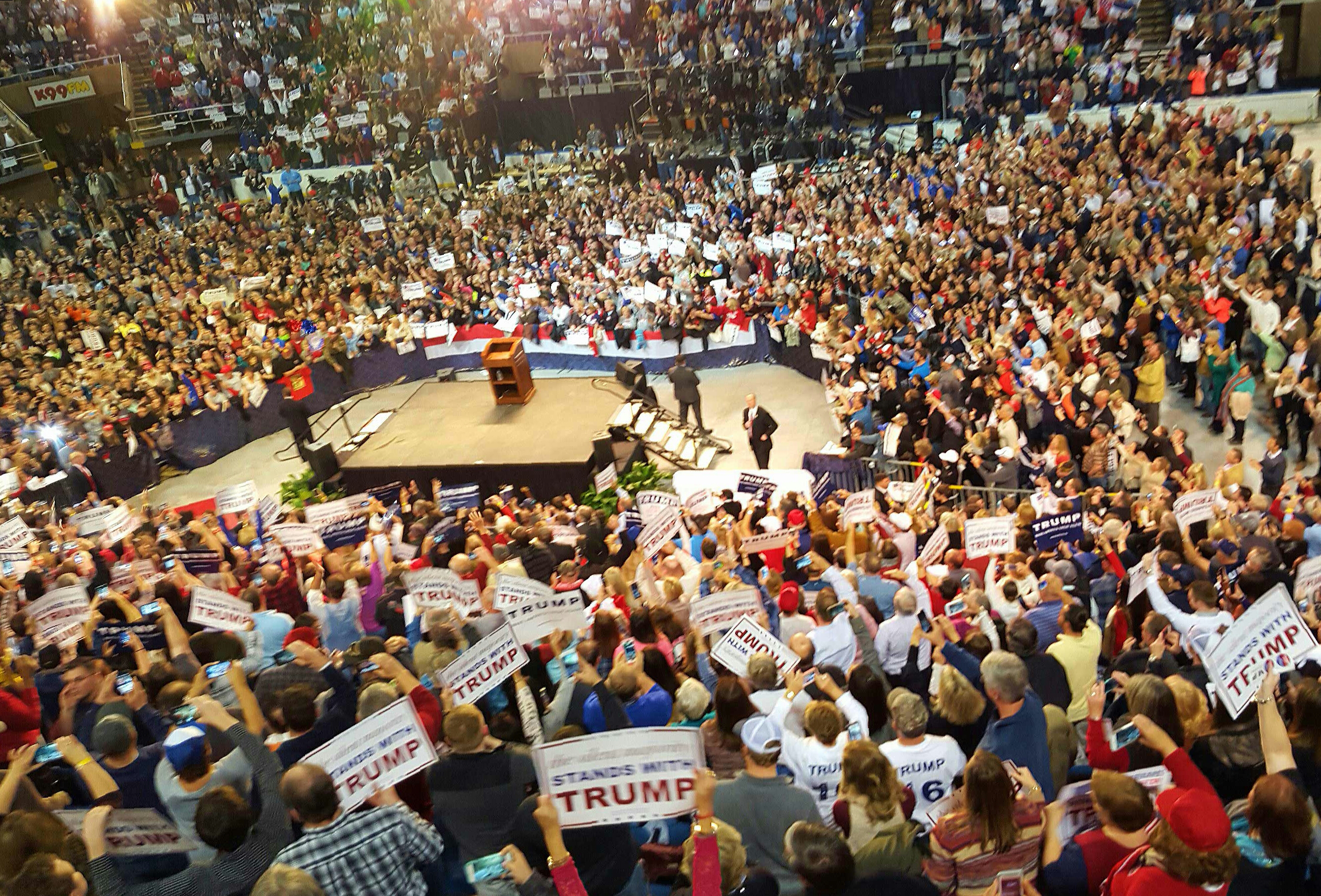 “So great to be here, we’ve set the record for largest crowd ever in this arena, plus thousands in the overflow room, plus thousands who will go home upset because they couldn’t get into either…but nice to set the record for this arena, which has been around for a while, I mean… it looks pretty worn, honestly…the Washington Post today, they had an article that called me plainspoken – what does that mean? I went to Wharton, which, you should know, is practically impossible to get into. My father went to MIT. But I’m plainspoken, I guess, the truth is that we have the smartest team, the smartest supporters, and we want to make American great again!”*